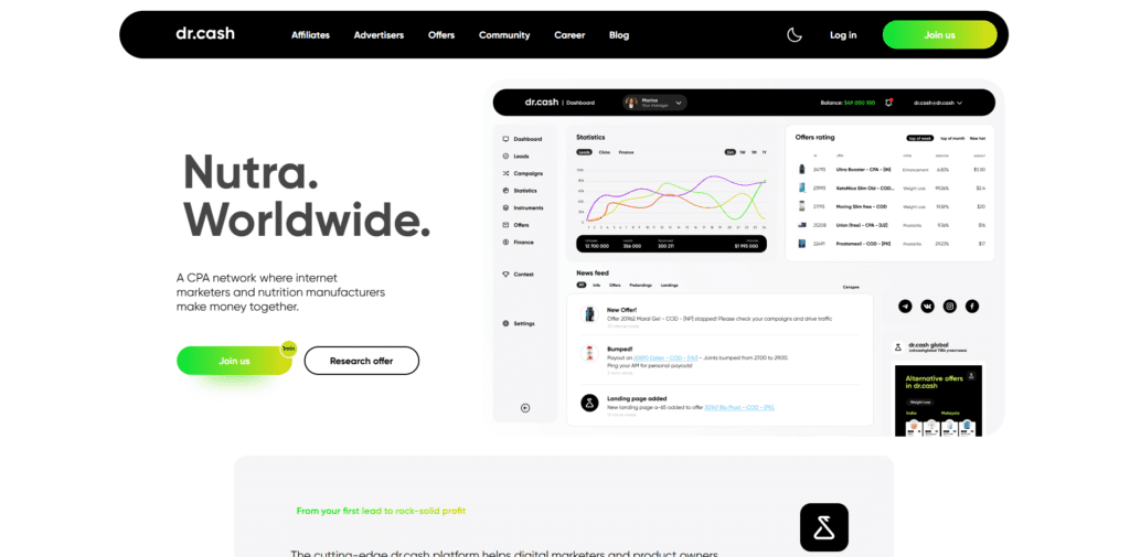 Dr Cash is a specialised CPA network focused on health and beauty offers. It features over 2,000 Nutra products across weight loss, supplements, and skincare niches. The platform is known for fast payouts and minimal holding periods. Dr Cash provides call centres, technical support, and strong conversion rates. Affiliates benefit from international traffic coverage and stable earnings. It is especially suitable for Nutra-focused marketers.