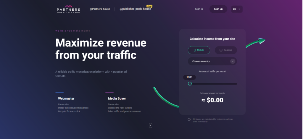 Partners. House has established itself as a favorite among webmasters for its highly effective monetization through push notifications. This specialized approach offers a seamless and lucrative way for blog and website owners to convert their traffic into substantial revenue. The platform is designed for simplicity and efficiency; users simply register to obtain a code, integrate it into their site, and immediately start generating income. Beyond direct monetization, Partners. House incentivizes growth with a referral program, rewarding you with an extra 3% of your referrals’ earnings.