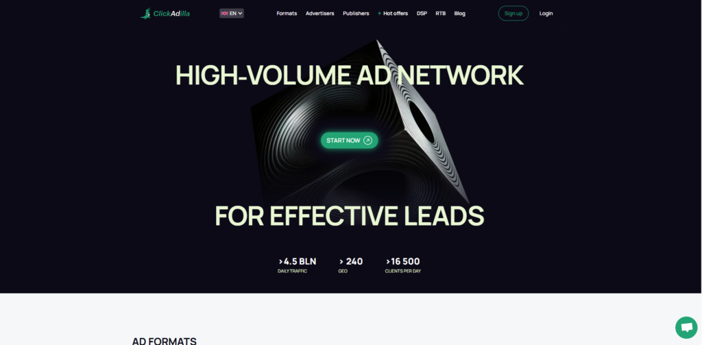 ClickAdilla connects you to billions of daily views from some of the world’s top entertainment sites. It is a powerhouse for Video CPV (Pre-Roll) and Pop-Under CPV. If you have a video creative, you can buy “In-Stream” views where users watch your ad before their main content loads. Their “Premium” traffic tier allows you to bid higher CPV rates to access users with a proven history of spending money, filtering out “window shoppers.” Their real-time bidding (RTB) engine ensures you pay the fair market price for every view.