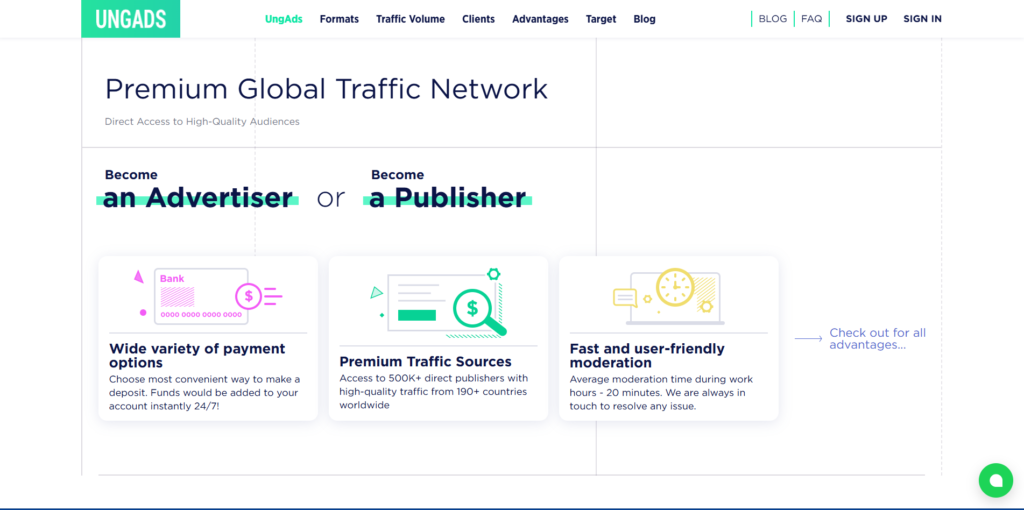 UngAds is a reliable mid-tier network with a massive network of 500,000+ direct publishers. They focus on “Clean” Pop-Under CPV traffic, employing strict compliance teams to ensure your ads don’t appear on bot farms or fake sites. This focus on quality over sheer quantity makes them a great choice for advertisers who are tired of burning budgets on bot views. Their “Smart CPA” tool allows you to bid on a CPV basis but auto-optimizes based on your conversion cost, effectively bridging the gap between branding (views) and performance (sales).