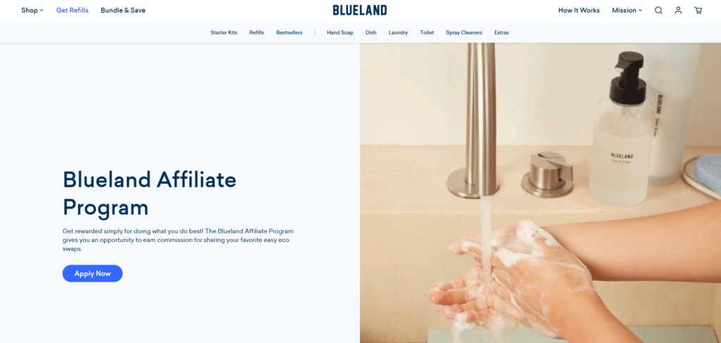 Blueland has taken the eco-friendly world by storm with its “forever bottle” concept, famously featured on Shark Tank. Their mission is to eliminate single-use plastic packaging from cleaning routines entirely. Instead of buying water-heavy plastic bottles, customers purchase a durable glass or acrylic bottle once and refill it with dry tablets that dissolve in water. Their product line covers hand soap, multi-surface sprays, laundry tablets, and dishwasher detergent, all free from triclosan, parabens, and phosphates. For affiliates, Blueland is a powerhouse because of its high visual appeal on social media and its strong retention model. Once a customer buys the bottles, they keep coming back for refill tablets. The brand is also B Corp certified and Climate Neutral, adding a layer of trust for conscious consumers.