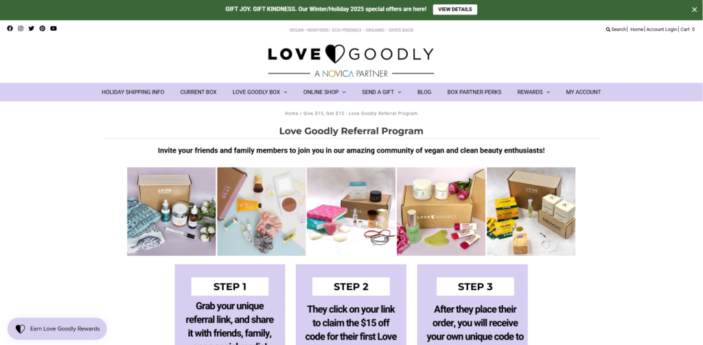 LOVE GOODLY is a subscription box service founded by mothers who wanted to make it easier for women to switch to non-toxic beauty and personal care products. Every other month, subscribers receive a box filled with 4-5 mostly full-sized, cruelty-free, and vegan items, including skincare, wellness accessories, and healthy snacks. Industry experts curate the boxes to ensure that every product meets strict “do not harm” standards, excluding banned chemicals found in mainstream cosmetics. A portion of every purchase supports a partner charity, adding a philanthropic angle to the subscription. For beauty and lifestyle influencers, LOVE GOODLY offers a consistent revenue stream through its subscription model, with the added benefit of promoting brands that are safe for both the user and the environment.
