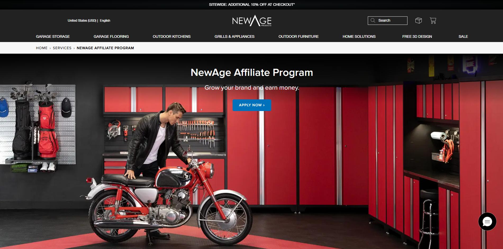 NewAge Products is a heavyweight in the garage organization and storage sector, offering premium cabinetry, slatwalls, and flooring solutions that redefine the garage workspace. Their affiliate program is particularly attractive because of the incredibly high average order value; a full garage cabinet set can easily cost between $1,000 and $5,000. While they are known for garage items, they also sell outdoor kitchen and home bar setups, giving affiliates room to expand. The brand is synonymous with durability and professional-grade aesthetics, appealing to homeowners who want a “showroom” quality garage. For bloggers and influencers, NewAge provides high-quality marketing assets and a product that looks stunning on camera. The generous cookie duration is a standout feature, acknowledging that customers often take weeks or months to plan and purchase large renovation projects, ensuring you get credit for the sale even if the buyer hesitates.