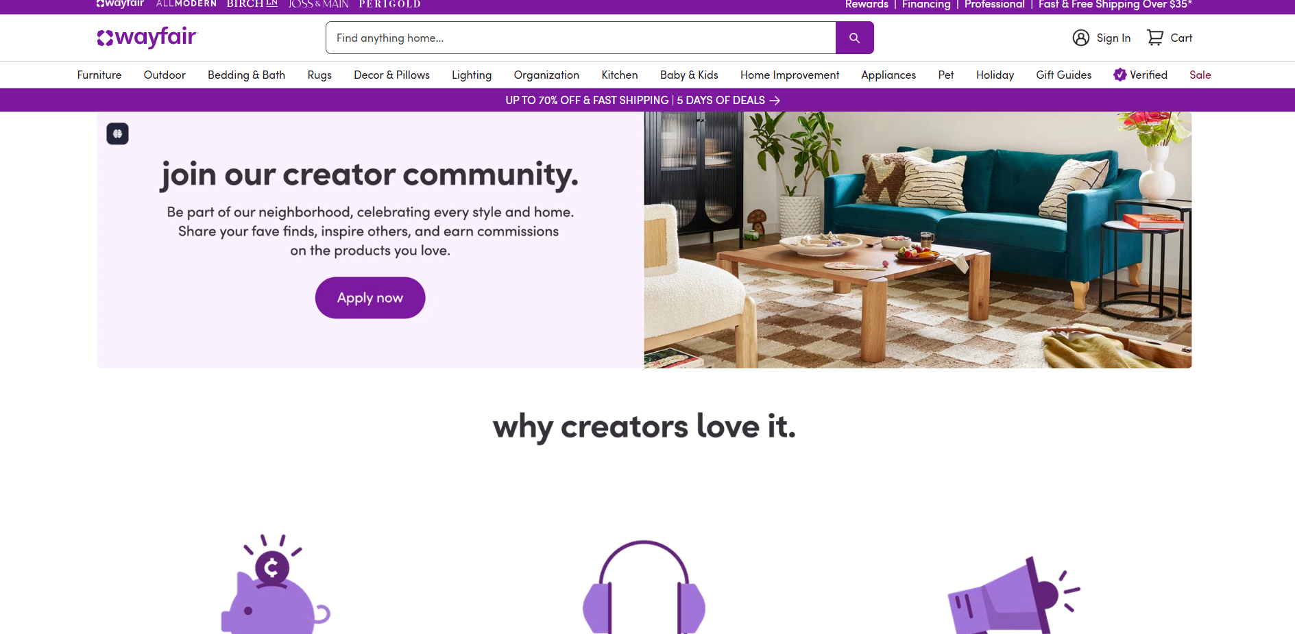 Wayfair might be known for furniture, but it has aggressively expanded into the home improvement and garage renovation space. They carry an impressive selection of garage storage racks, workbenches, lighting fixtures, and even portable garages and carports. The visual nature of Wayfair’s website makes it very easy to promote; the product photos are high-quality and styled well. For affiliates, Wayfair is a “high conversion” partner because they constantly run sales, offer free shipping on large items, and have a massive retargeting engine that follows your visitors around the web, increasing the chance they eventually buy. This program is perfect for “Garage Makeover” inspiration posts where the focus is on aesthetics, lighting, and furniture rather than the mechanical door parts. Their high average order value on storage furniture makes up for the somewhat standard commission rates.
