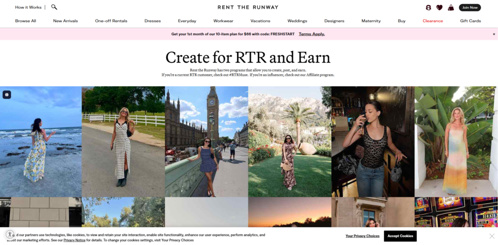 Rent the Runway transformed the fashion industry by allowing women to rent designer clothing and accessories for a fraction of the retail price. Their “Closet in the Cloud” offers everything from gala gowns to workwear and designer handbags, making luxury accessible for everyday use. This model appeals strongly to the “experience over ownership” demographic and those needing outfits for special events. The affiliate program is particularly effective for content creators who focus on sustainability, minimalism, or event styling. By promoting rentals, you offer your audience a smart, budget-friendly way to wear top-tier designers like Oscar de la Renta and Tory Burch.