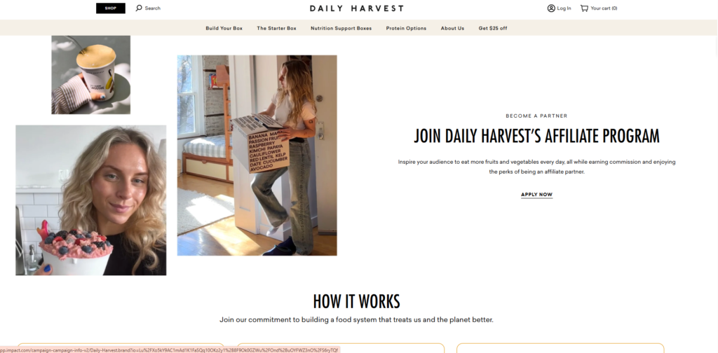 Daily Harvest has revolutionized frozen food by delivering delicious, farm-frozen fruits and vegetables directly to customers’ freezers. Their diverse menu includes smoothies, harvest bowls, oat bowls, and flatbreads, all of which are gluten-free and vegan. By freezing ingredients at peak ripeness, they lock in nutrients and flavor without the need for preservatives or additives. This program is supported by massive national marketing campaigns, ensuring high brand recognition among your audience. It is an excellent choice for affiliates in the lifestyle and parenting niches who value convenience and health.