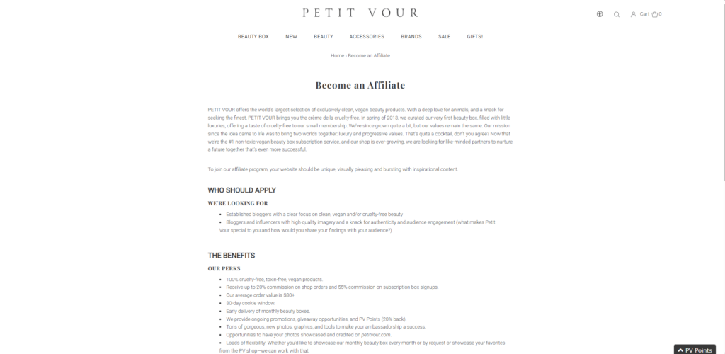 Petit Vour is the premier destination for “cruelty-free luxury,” offering a highly curated subscription box and an online boutique. They rigorously vet every product to ensure it is non-toxic, vegan, and ethically manufactured, removing the guesswork for consumers. Subscribers receive a monthly selection of high-end beauty samples, which often leads them to purchase full-sized versions from the shop. This dual model—subscription box plus retail stor gives affiliates multiple ways to earn commissions from a single customer. It is the perfect program for beauty bloggers targeting an upscale, ethical demographic.