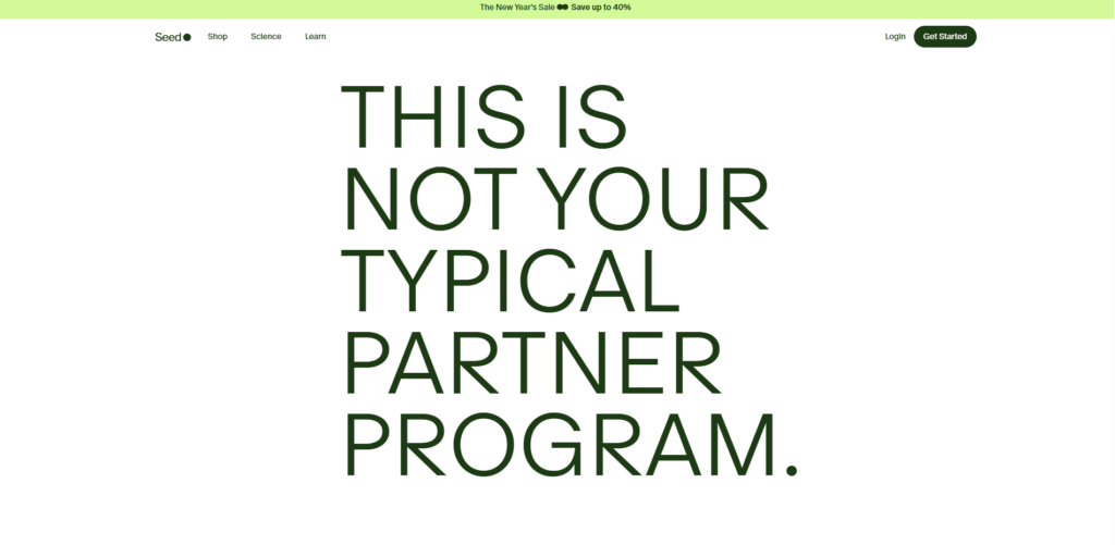 Seed is a “synbiotic” (probiotic + prebiotic) that has set a new standard in the gut health industry with its rigorous scientific validation. While their Daily Synbiotic is vegan and gluten-free, their marketing focuses on advanced science, survivability in the gut, and systemic health benefits. They are incredibly popular among wellness influencers because of their sleek, sustainable packaging and credible research. Promoting Seed elevates your brand by associating it with science-backed wellness rather than just trends. Their high customer retention rate means your referrals are likely to stick with the product.